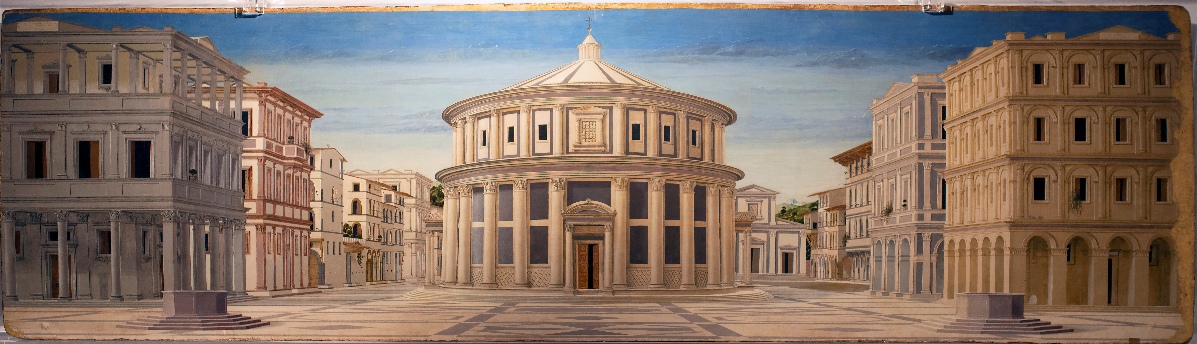 拉斐尔是乌尔比诺人,现在让我们来看看这幅描绘乌尔比诺的《理想之城》,这是一幅创作于 1490 年左右的作品。这幅画尝试了平行透视(一点透视),表现的是纯粹的建筑,没有人的存在。描绘的城市体现了一种愿景,用人文主义的方式看待世界,一座真、善、美的城市。