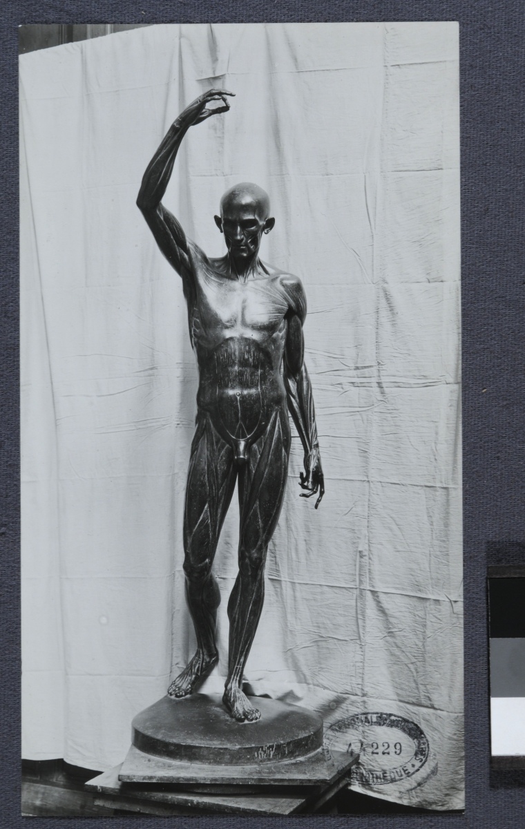 这件作品是乌东的《解剖形态》,它是一座大型的青铜雕像,高2米,铸造于1792年,现存于巴黎国立高等美术学院。这件作品中,人在向前迈进,他用铅垂线丈量世界,寻找真相,尤其是隐藏在表象背后的真相,甚至是隐藏在皮肤之下的真相。目光变得更具批判性,也更具政治性:人类正通过知识和科学走向解放。《解剖形态》是关于革命和进步的、它仍然是以城市为中心的自然秩序。