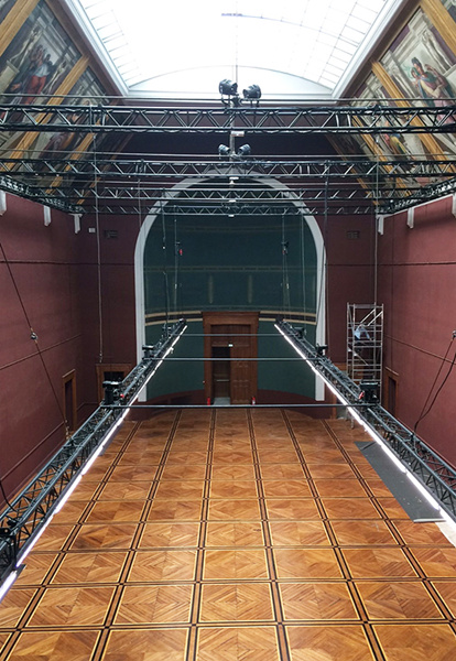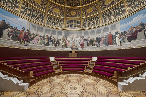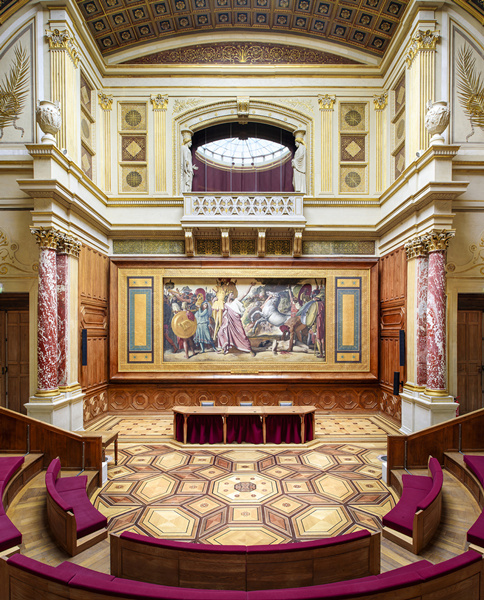 随着1839年研习宫落成,保罗·德拉罗什(Paul DELAROCHE,1797-1856)终于在1841年完成了荣誉厅半圆形墙上的壁画《各艺术之守护神在各时代艺术家围绕下颁发荣誉奖》。不幸的是圆厅在1855年发生火灾。1856-1857年,德拉罗什的学生对作品进行了修复。安格尔1812年的巨作《罗慕路斯,阿克隆的征服者》 是1867年挂上的。两幅作品完美地契合了荣誉厅的属性,荣誉厅曾是罗马奖颁奖场所,学校中轴线最后的部分,获得至高荣誉的殿堂,它的地理位置如同古希腊庙宇建筑中置于最深处的藏宝室、神龛一般至关重要。荣誉厅呈半圆形,以及厅上部的设计让人联想到意大利的种种风格和经典建筑,比如罗马的万神殿。