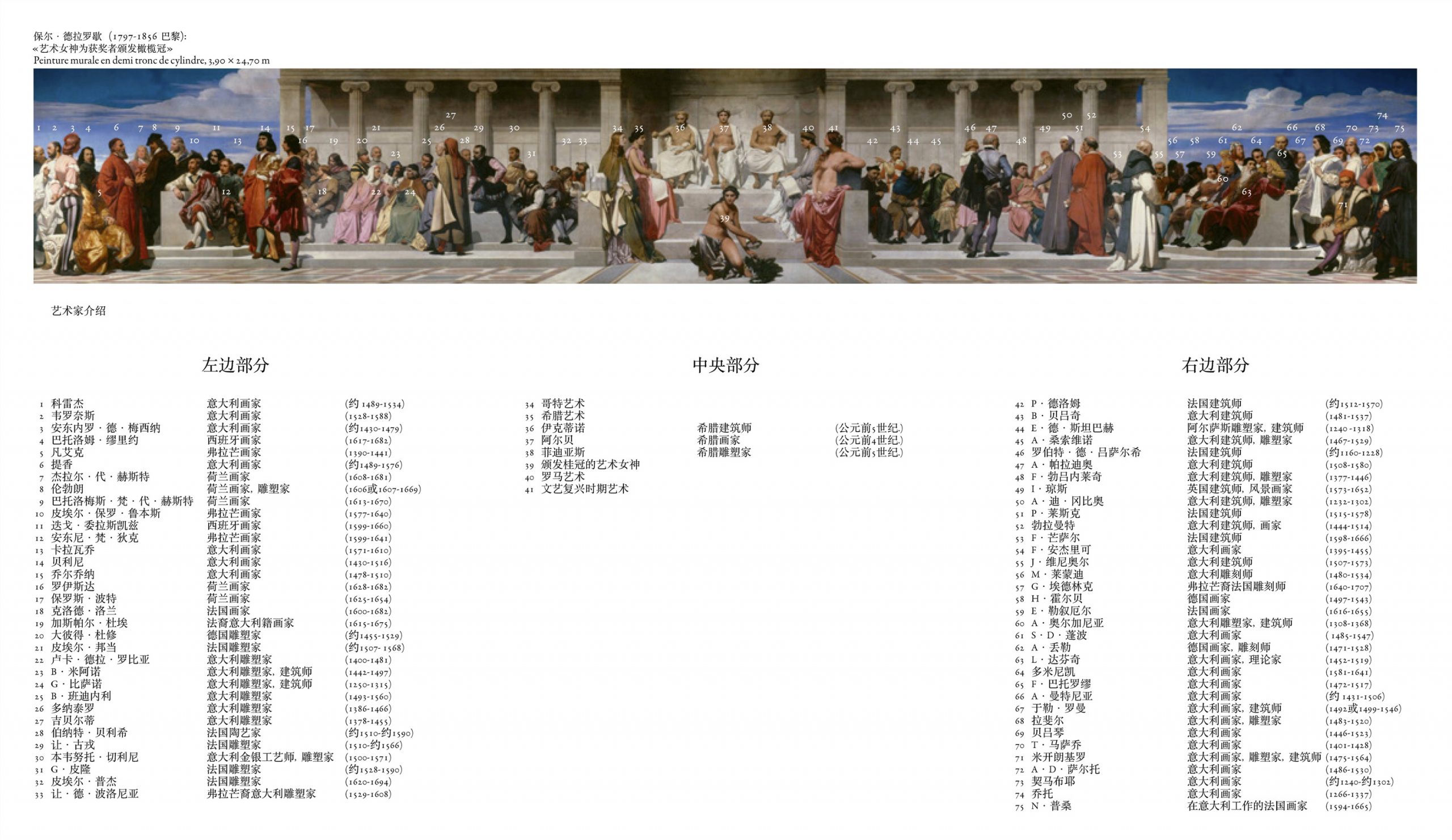 壁画《各艺术之守护神在各时代艺术家围绕下颁发荣誉奖》画有75位人物,中间可以看到三位古希腊著名艺术家:伊克蒂诺Ictinos、阿尔贝Apelle 、菲迪亚斯Phidias组成的评审团;座前的四位女子分别象征着古希腊、古罗马、哥特以及文艺复兴时期的艺术;六十七位艺术家分列两侧,左边的艺术家主张色彩优先,右边的则更注重素描。最前方的人物是一位很著名的巴黎的神明形象——艺术女神。