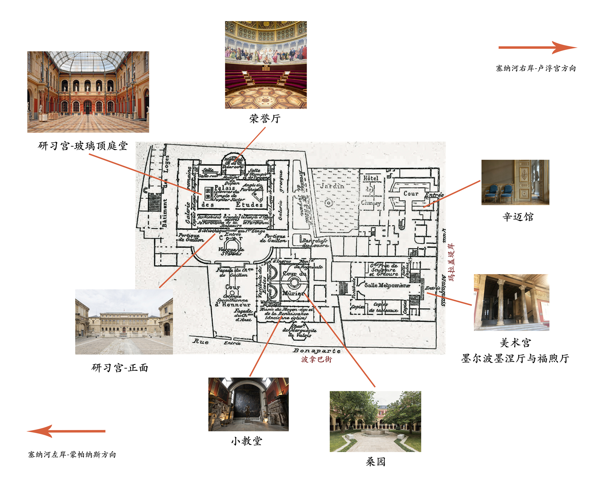 当时,弗朗索瓦·德布雷(François DEBRET,1777-1850)负责美院的新址设计建造。最早建成的是研习宫左侧的一栋楼(Bâtiment des loges),其内部被分割成多间“单人考试间”,用作竞试。德布雷构思建造的研习宫,最终则由他的学生、妹夫,也是1823年罗马奖获得者菲利克斯·杜班(Félix DUBAN,1797-1870)继任完成。杜班受到罗马的屋大维娅廊柱(Porticus Octaviae)遗迹的启发,根据施工现场被保留的各种古迹残存物,巧作设计。