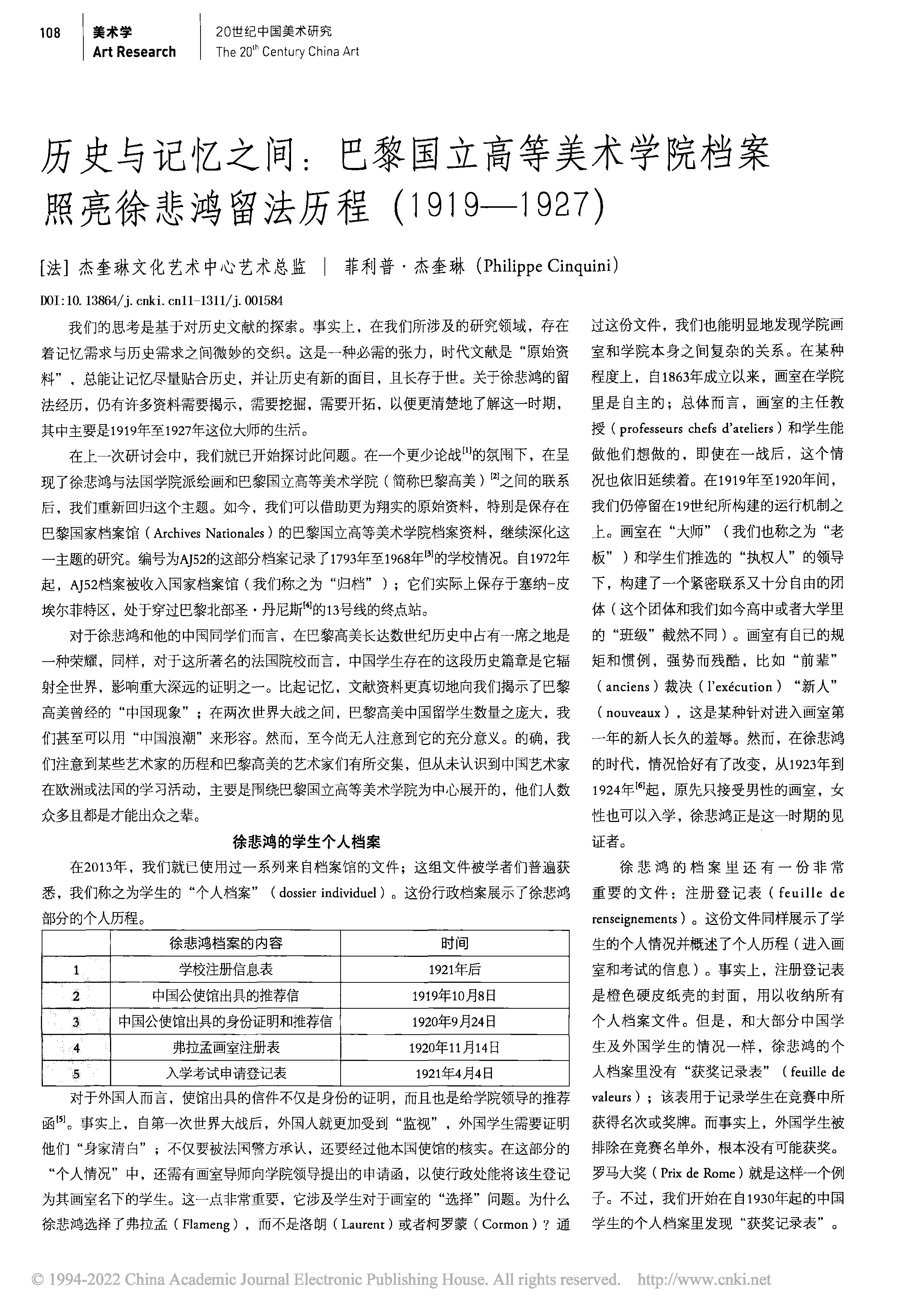 菲利普·杰奎琳(Philippe Cinquini),《历史与记忆之间:巴黎国立高等美术学院档案照亮徐悲鸿留法历程(1919-1927)》,载于《美术》,2016年第3期,第108-112页。