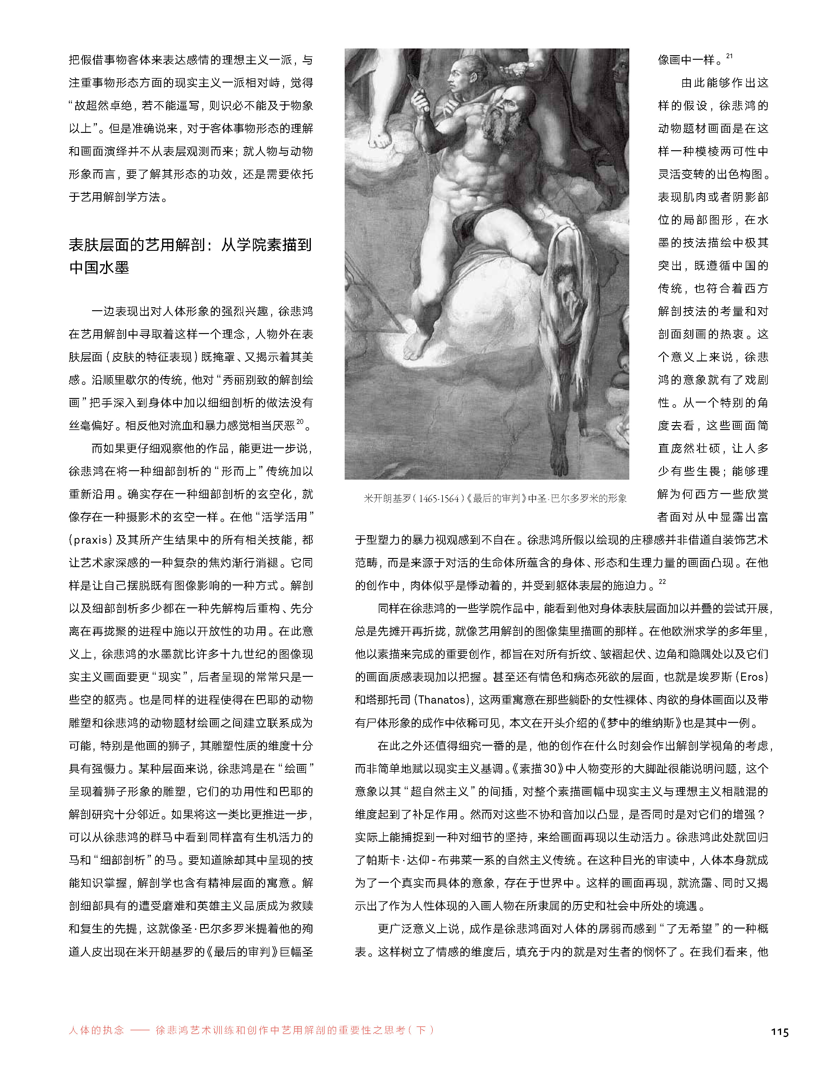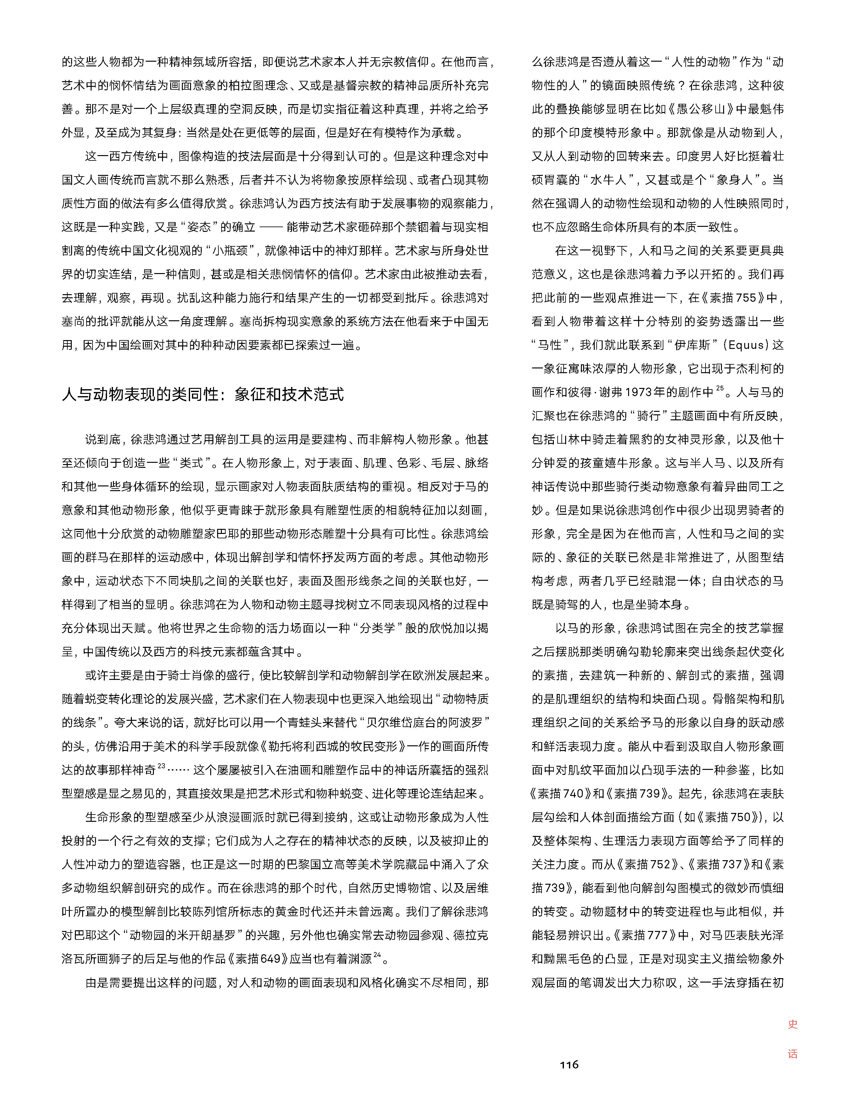 从技术和符号学的层面上,艺用解剖将徐悲鸿的作品引导向一些历史经典问题(生理学、形态学、运动研究等),然而这些问题在20 世纪初的西方和中国形成了一股特别的趋势,其中人类自身及其一边被科学更新推动、一边又受迫于权力场重压的自身形象表现,都逐渐陷入没落。