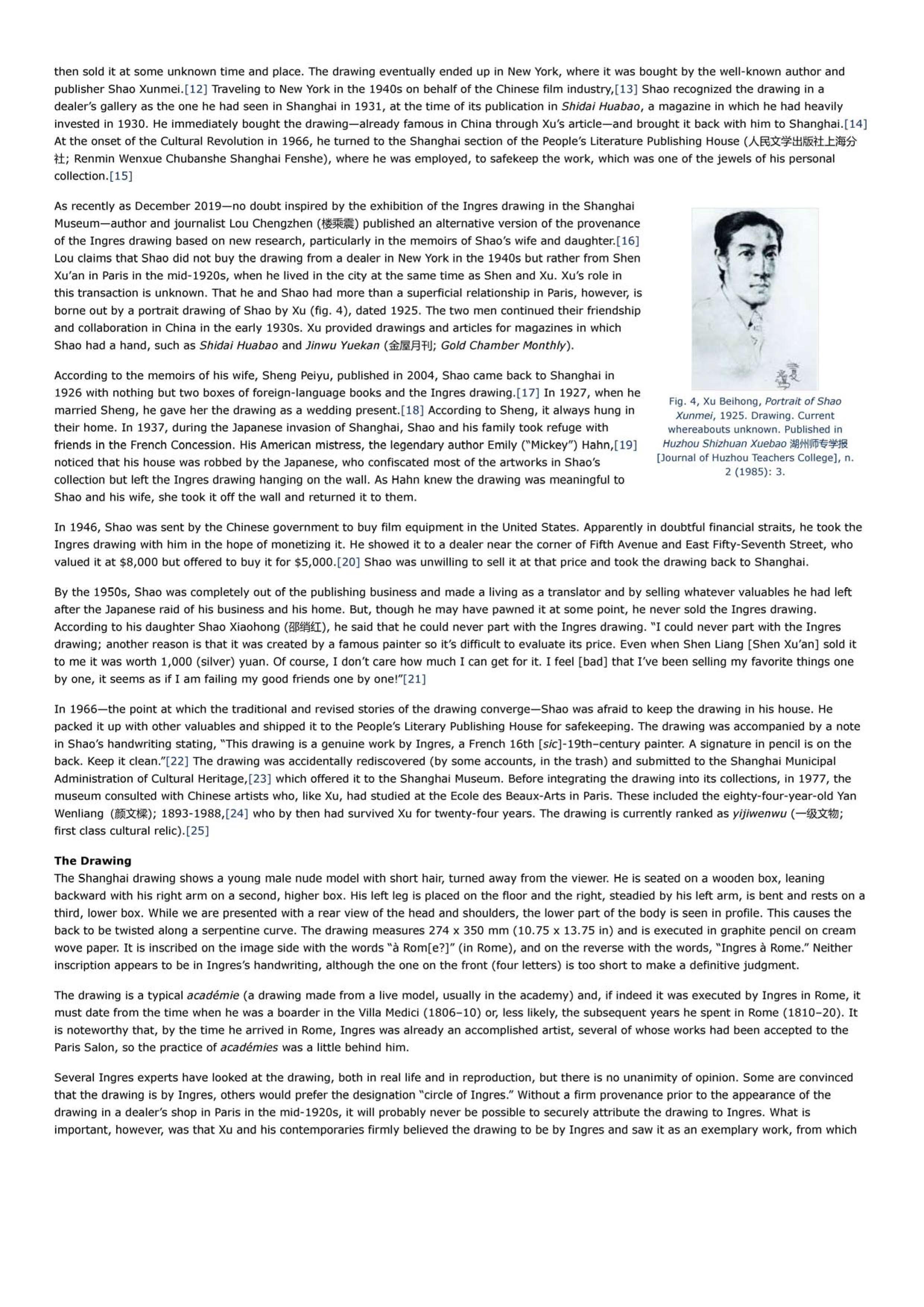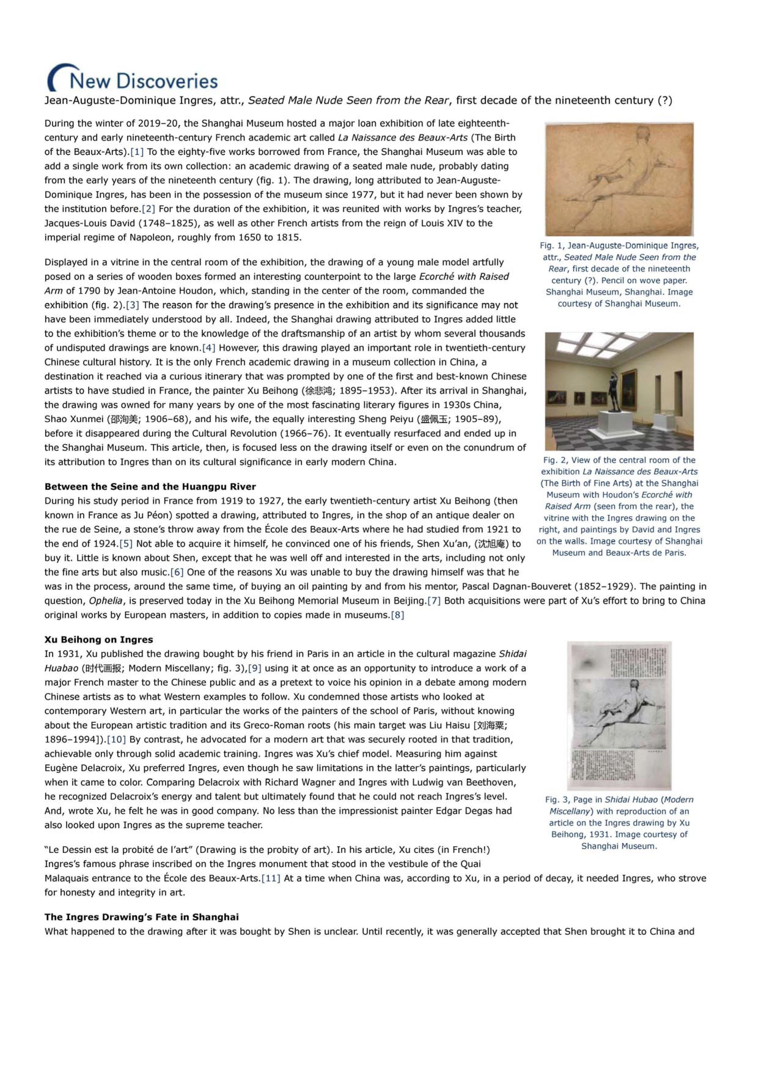 2019-2020年冬,上海博物馆举办了一场大型展览,名为“美术的诞生”(La Naissance des Beaux-Arts),借展作品主要来自18世纪末、19世纪初的法国学院艺术[1]。展览中,除法国借展的85件作品之外,还有一件上海博物馆自己的馆藏作品:一幅男性裸体坐像学院素描,很可能是19世纪初创作的作品(图1)。长期以来,这幅画被视为让-奥古斯特-多米尼克·安格尔(Jean-Auguste-Dominique Ingres,1780-1867)的作品,自1977年之后一直为上海博物馆所有,但从未展出过[2]。展览期间,与该作品同时展出的还有安格尔的老师雅克-路易·大卫(Jacques-Louis David,1748-1825)以及从路易十四统治时期到拿破仑帝国时期(约1650-1815年)其他法国艺术家的作品。