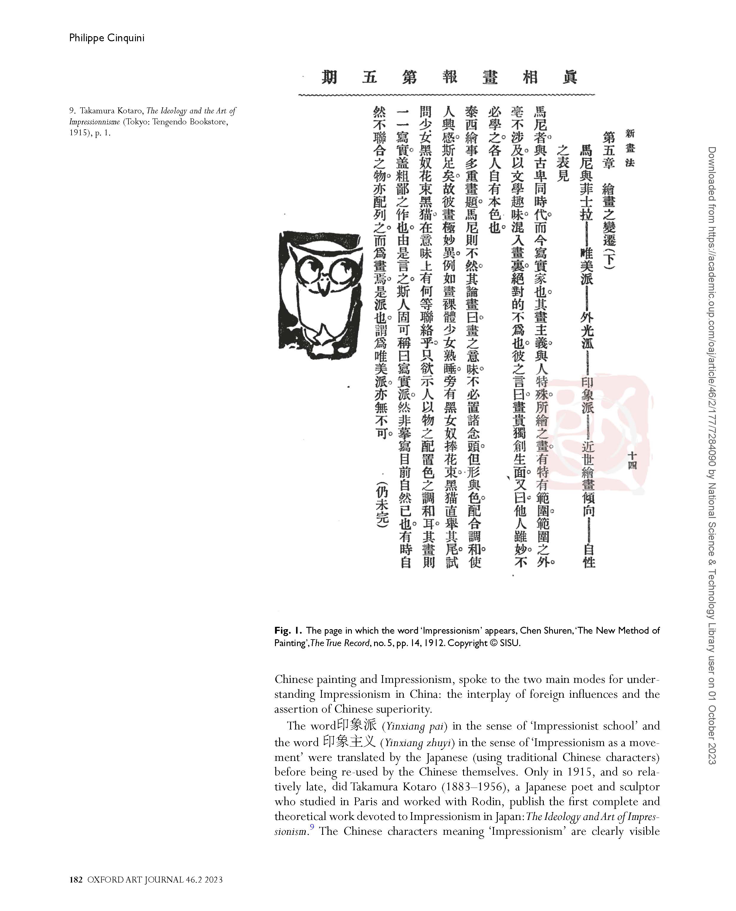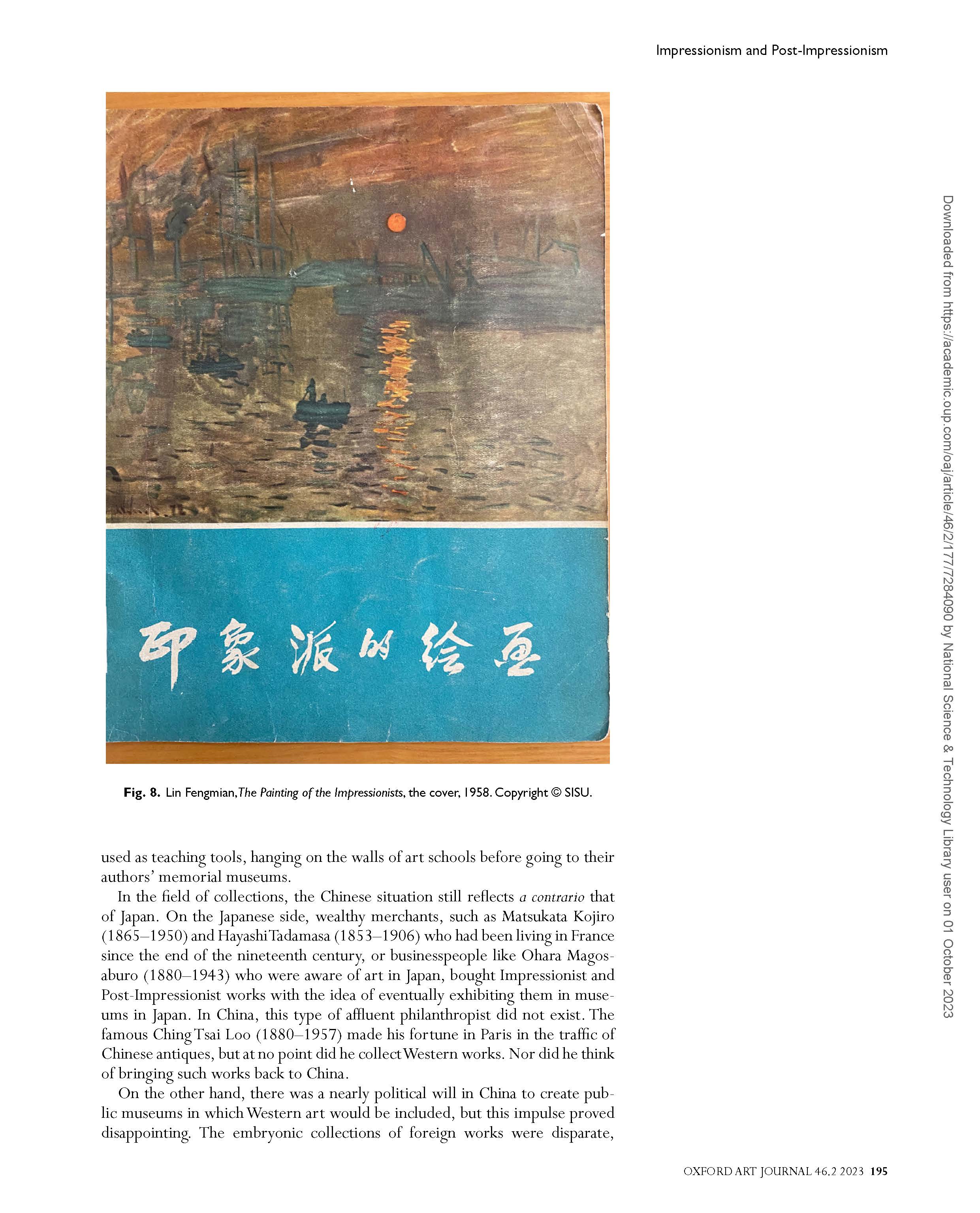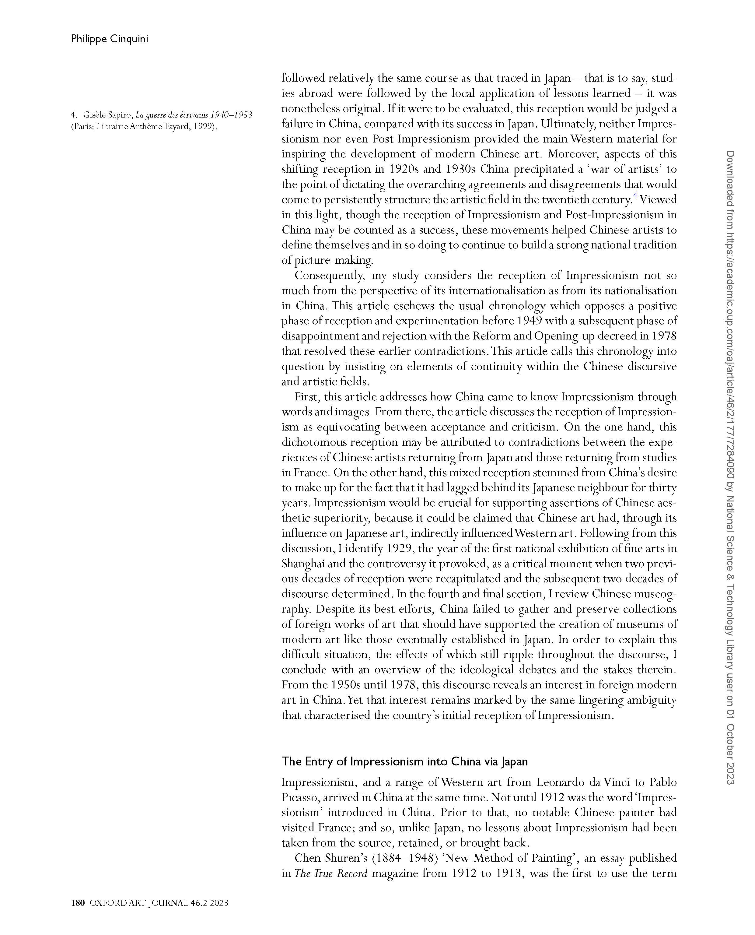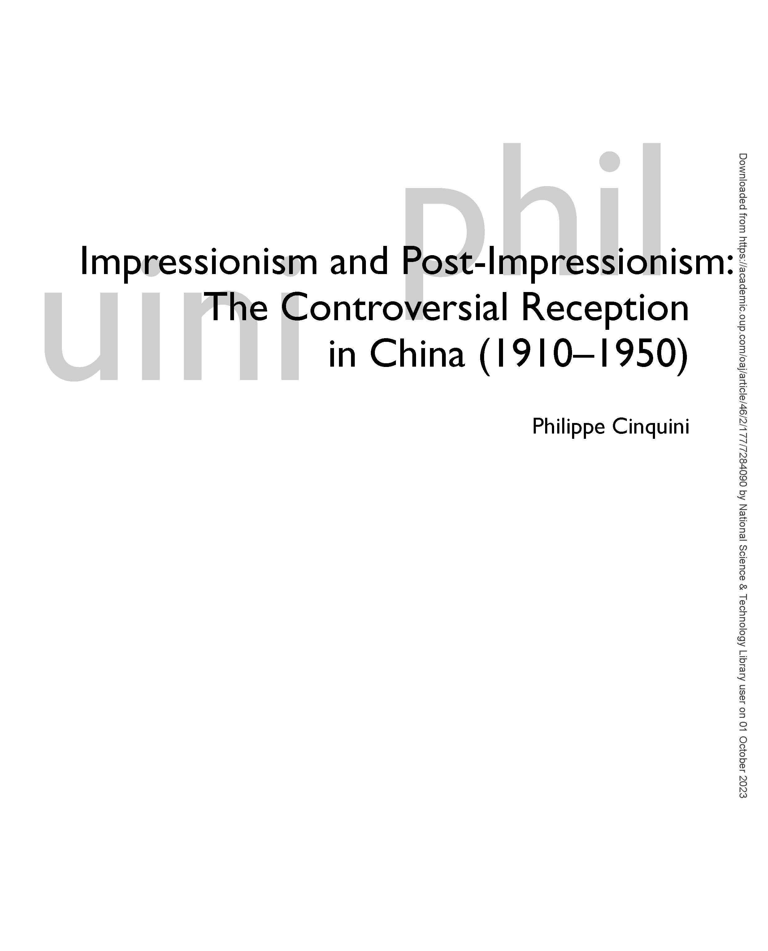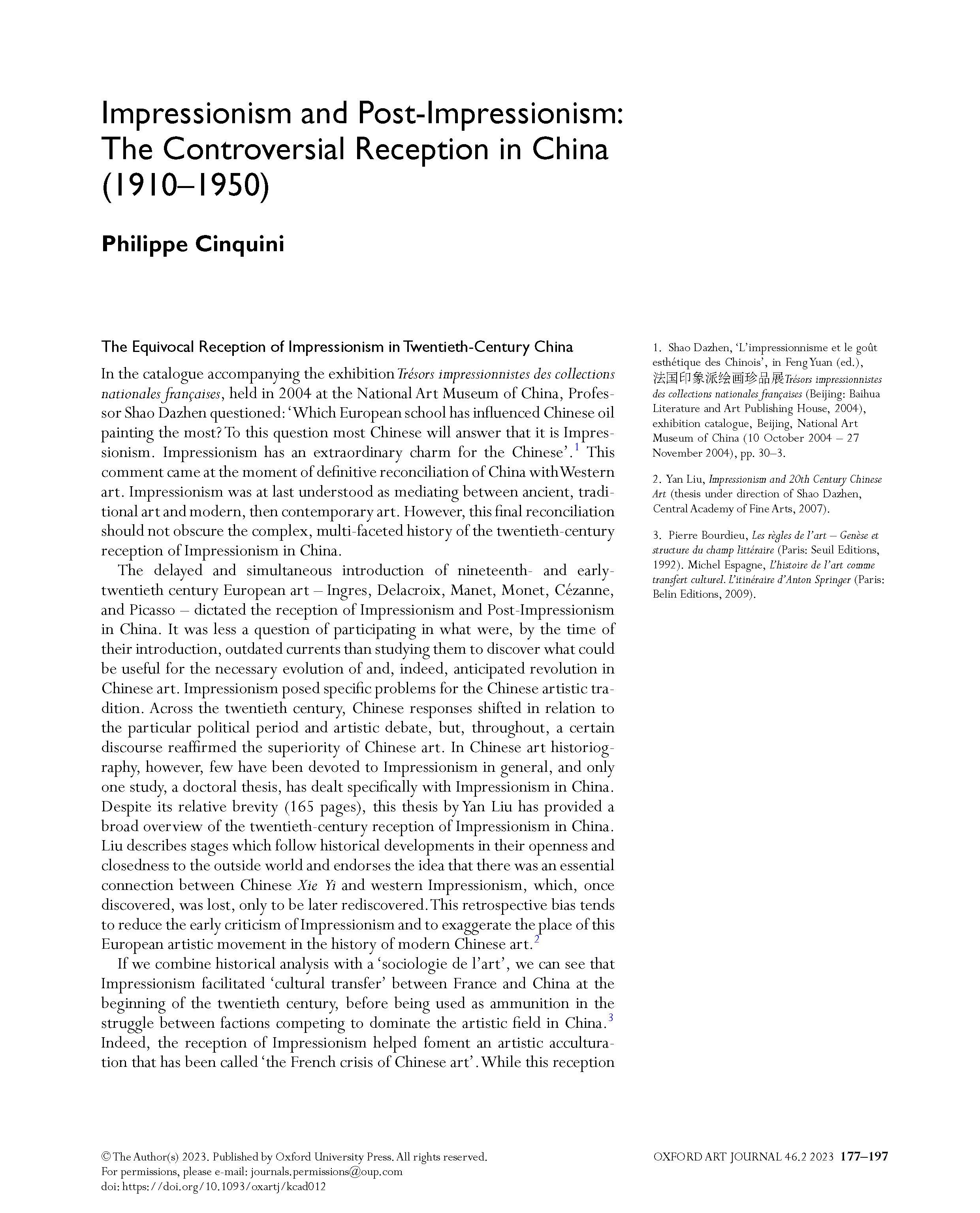 菲利普·杰奎琳(Philippe Cinquini),《印象派与后印象派在中国:争议和接纳(1910-1950 年)》,载于《牛津艺术杂志》(Oxford Art Journal),第46卷第2期,2023年8月,第177-197页。