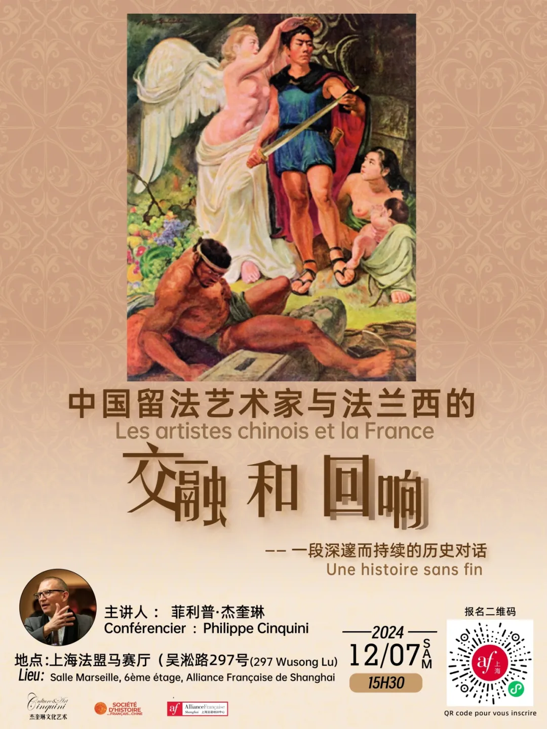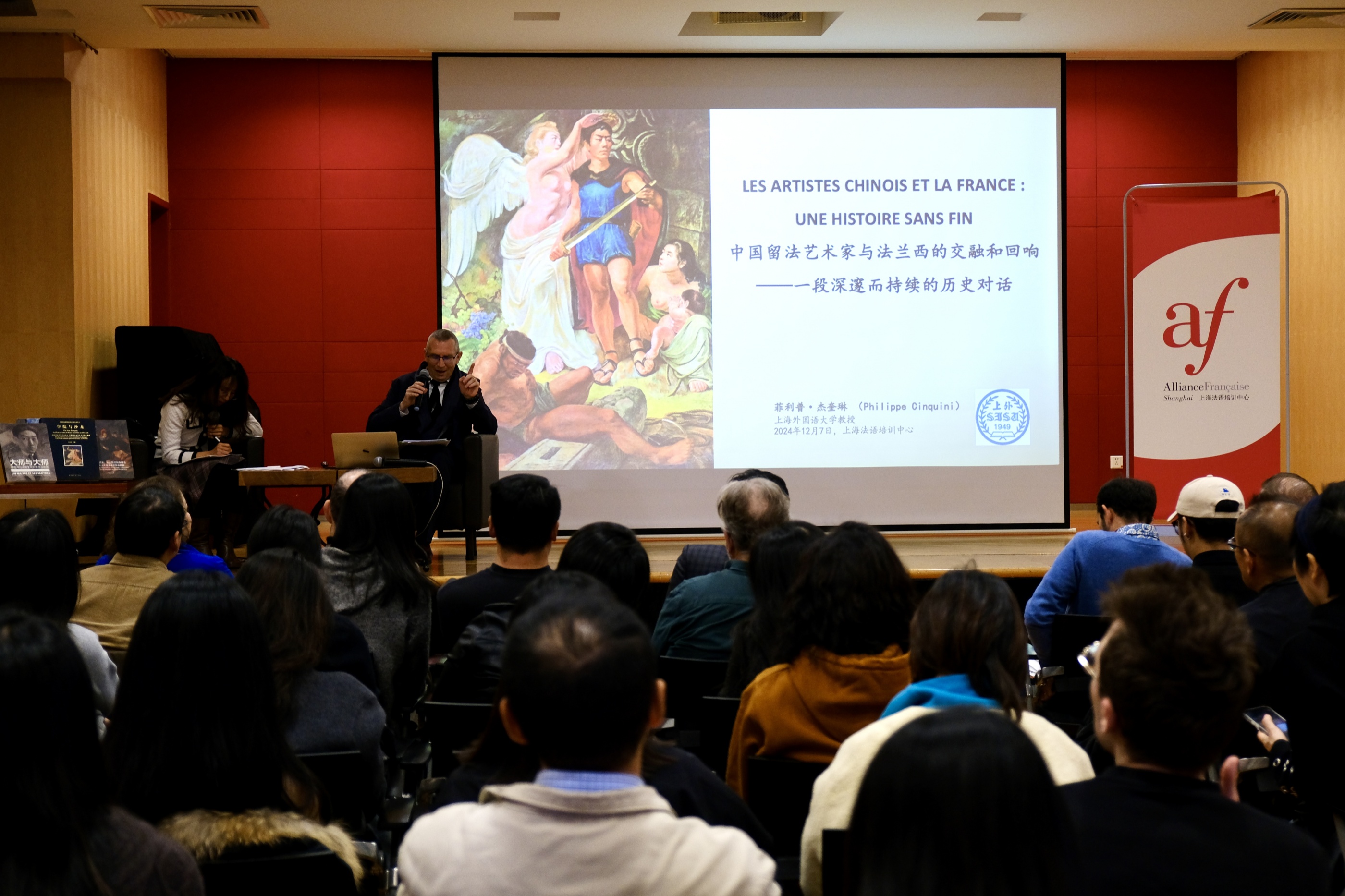 12月7日,上海法盟携手法国人在华历史学会,特邀上海外国语大学教授、法国知名展览策展人菲利普·杰奎琳先生(Philippe Cinquini)在马赛厅为大家带来一场讲座,透过巴黎国立高等美术学院这所代表了西方美术学院所遵循典范的艺术学府,带领我们共同回望20世纪东西艺术交流。